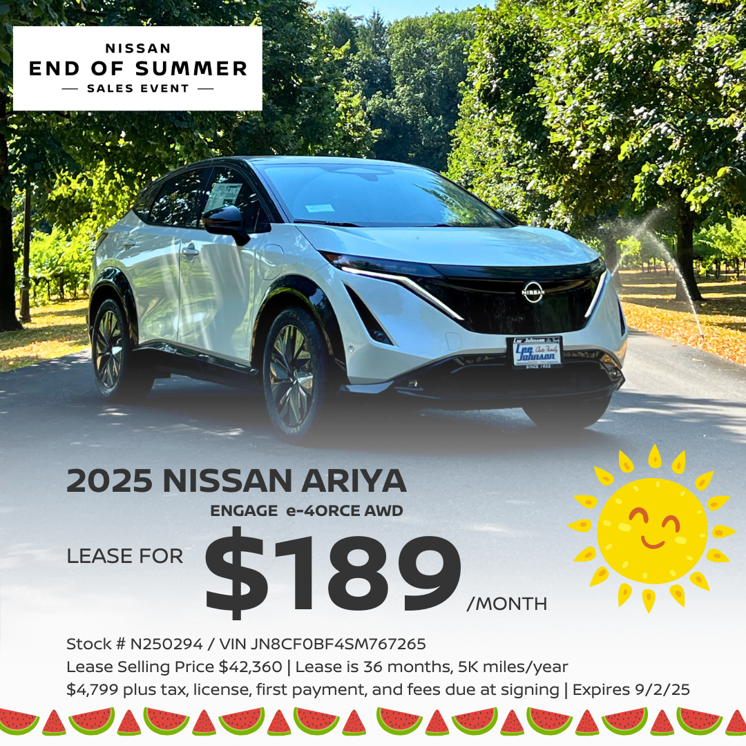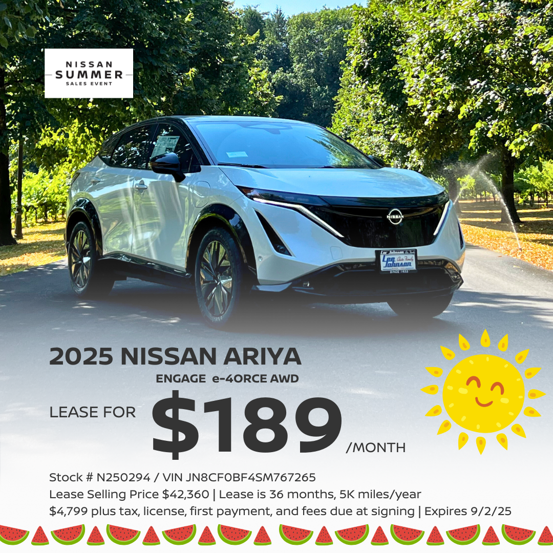Lease sale price: $37,606. Example stock number N250304 / VIN JN8AF0BE0SM464465. Lease is 36 months, 10K miles/year. $3,999 plus tax, license, first payment, and fees due at signing. MSRP $41,740 adjusted capitalized cost $21,976.97, residual value $2,035.20. Example stock number N250304. No security deposit. NILT credit tiers 1, 2, and 3 only. Lease offer cannot be combined with Consumer Cash. Negotiable $200 documentary fee added to purchase price or capitalized cost. Not all applicants will qualify for lowest leasing or purchase rates. All vehicles subject to availability and prior sale. Expires 06/30/2025