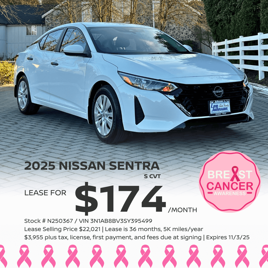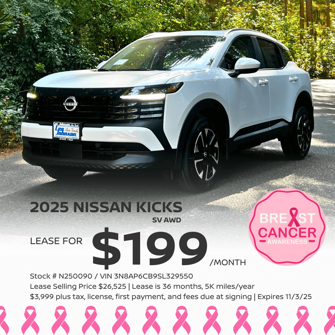 Lease selling price: $26,525. Lease is 36 months, 5K miles/year. $3,999 plus tax, license, first payment, and fees due at signing. MSRP $28,450 adjusted capitalized cost $22,220.21, residual value $18,492.50. Example stock number N250090 No security deposit. NILT credit tiers 1, 2, and 3 only. Lease offer cannot be combined with Consumer Cash. Negotiable $200 documentary fee added to purchase price or capitalized cost. Not all applicants will qualify for lowest leasing or purchase rates. All vehicles subject to availability and prior sale. Expires 11/03/2025.